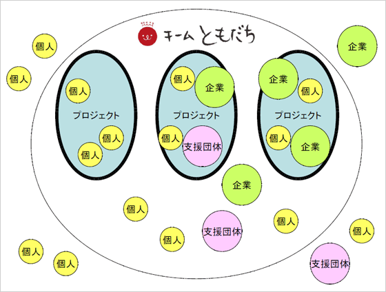 チームともだちは、個人や企業、支援団体などが参加しているとても緩やかな組織です