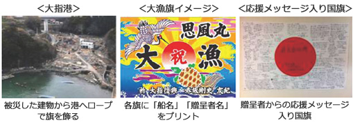 各大漁旗には、それぞれの船名とそれぞれの贈呈者名がプリント。37世帯分の37旗と、贈呈 者の応援メッセージが寄せ書きされた日本国旗を、1月1日元旦から3日間掲揚した後、それぞれの旗を各世 帯へ贈呈。また、贈呈者には同じデザインのミニ旗を各船主から送り、今後の交流を促します。