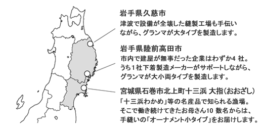 「東北グランマのクリスマスオーナメント(グランマオーナメント)」は、宮城県石巻市北上町十三浜大指 (おおざし )で長年にわたり漁業を営む女性たちをはじめ、岩手県九戸郡野田村、久慈市および陸前高田市で被災した女性たち(=今回のプロジェクトではグランマと呼んでいます)によって作られます。